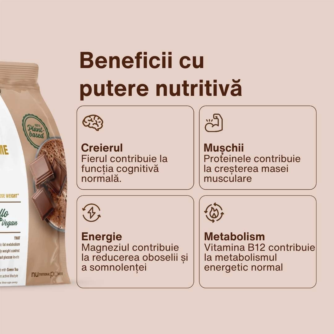 Este o pudră de ciocolată folosită înlocuitor de mese 100% vegană, cu ajutorul căreia se realizează un Shake cu gust delicios. În plus, are ingredientele active din surse naturale pentru pierderea în greutate.