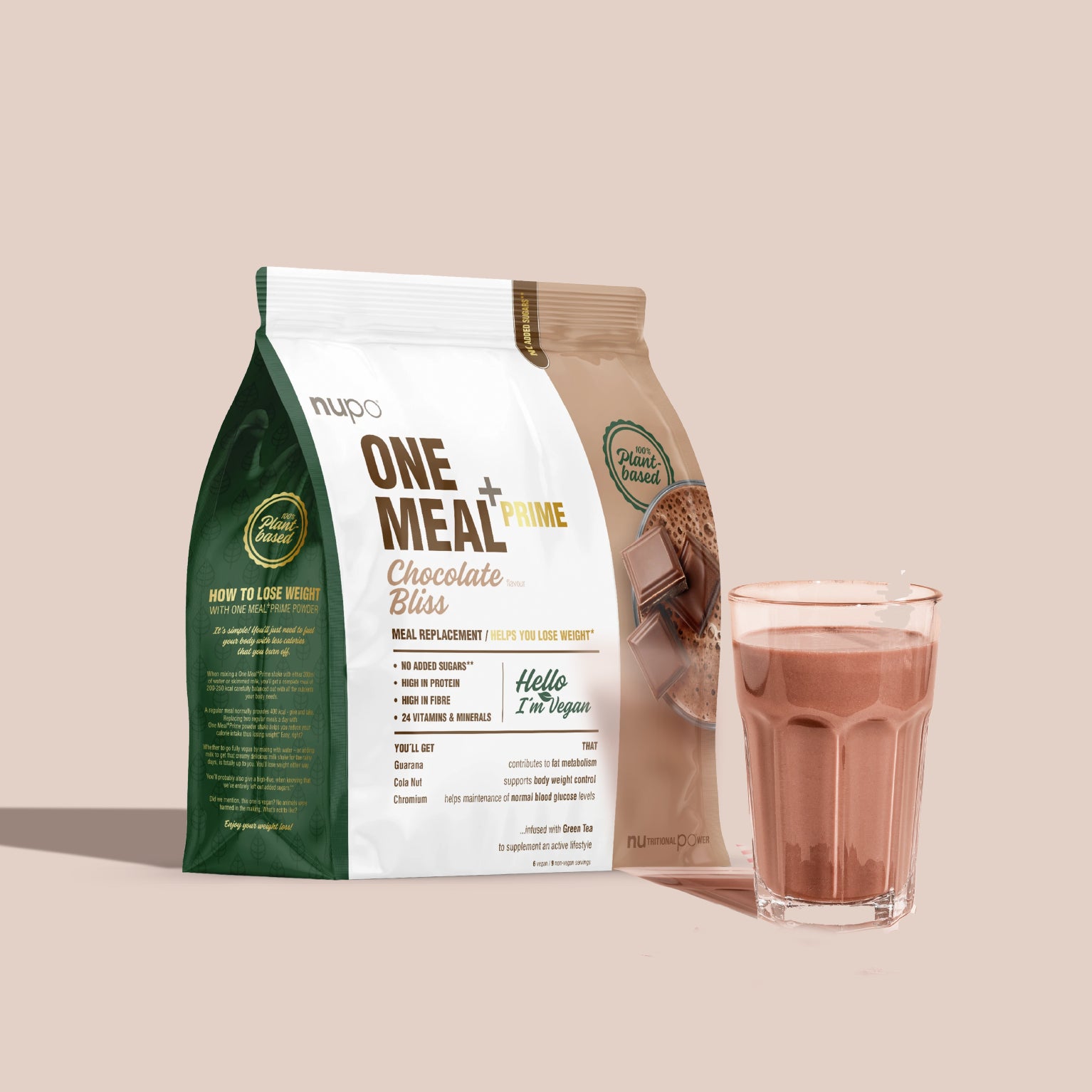 Nupo One Meal ⁺Prime Vegan  Chocolate Bliss  înlocuiește comod, rapid și sănătos o masă. Pe lângă gustul foarte plăcut, are din punct de vedere nutritiv, o compoziție completă și corectă, fiind recomandat atât pentru pierderea în greutate, cât și pentru și controlul greutății, dar și menținerea unui stil de viață sănătos.