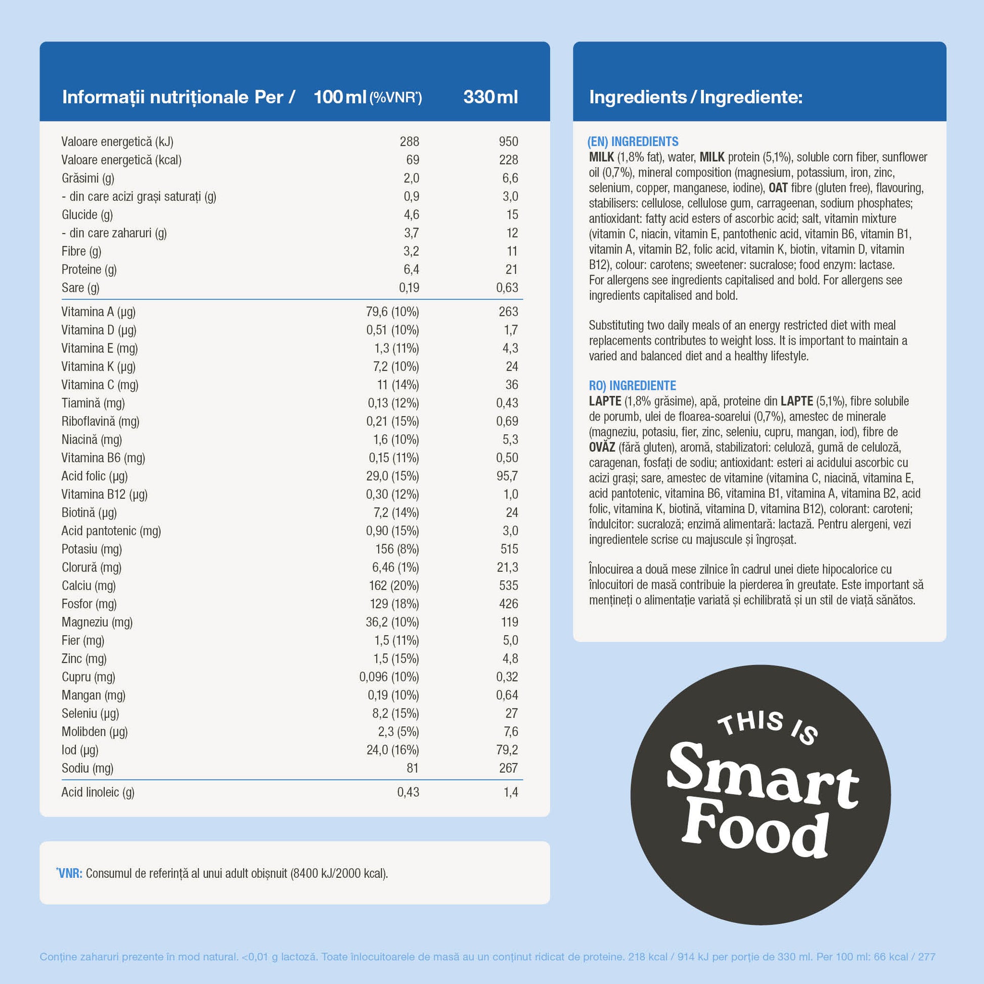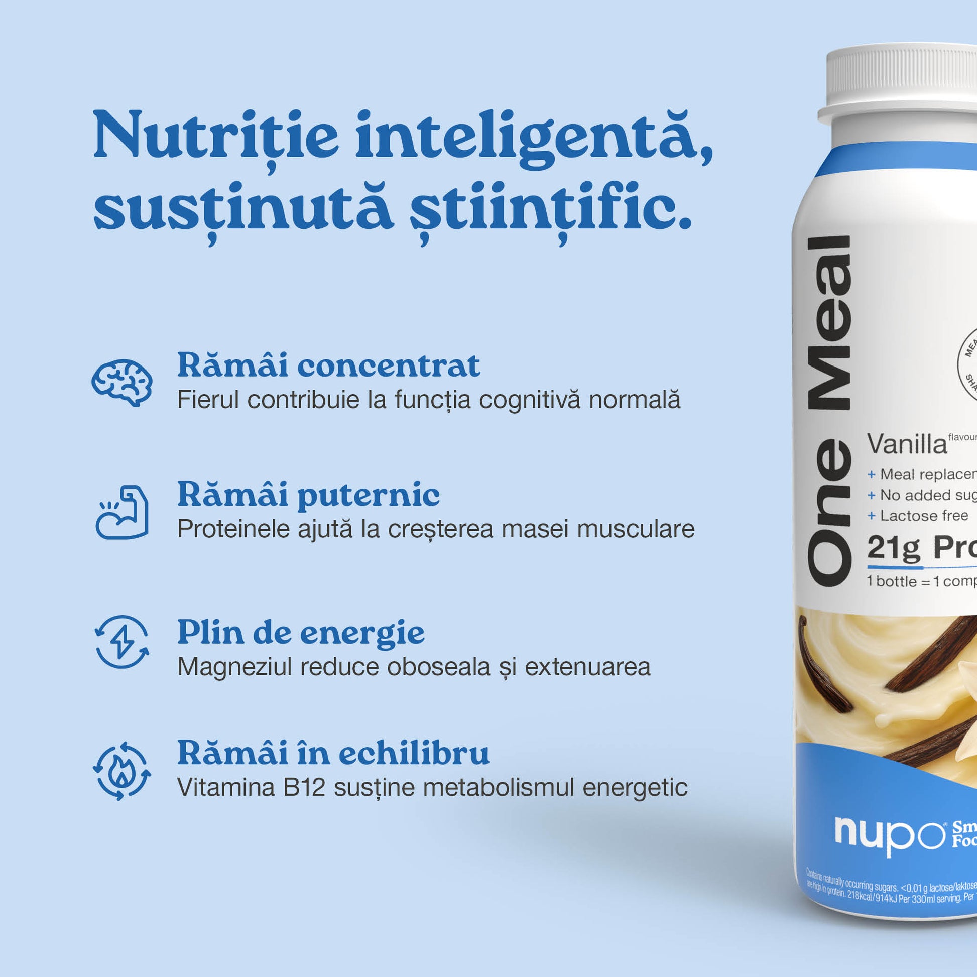 Este nutriție din mers. Un înlocuitor de masă pentru pierderea în greutate* și controlul greutății. *Consumat de două ori pe zi, în cadrul unei diete hipocalorice, contribuie la pierderea în greutate. Înlocuirea unei mese pe zi ajută la menținerea greutății după procesul de slăbire. O alimentație variată și echilibrată și un stil de viață sănătos sunt esențiale.